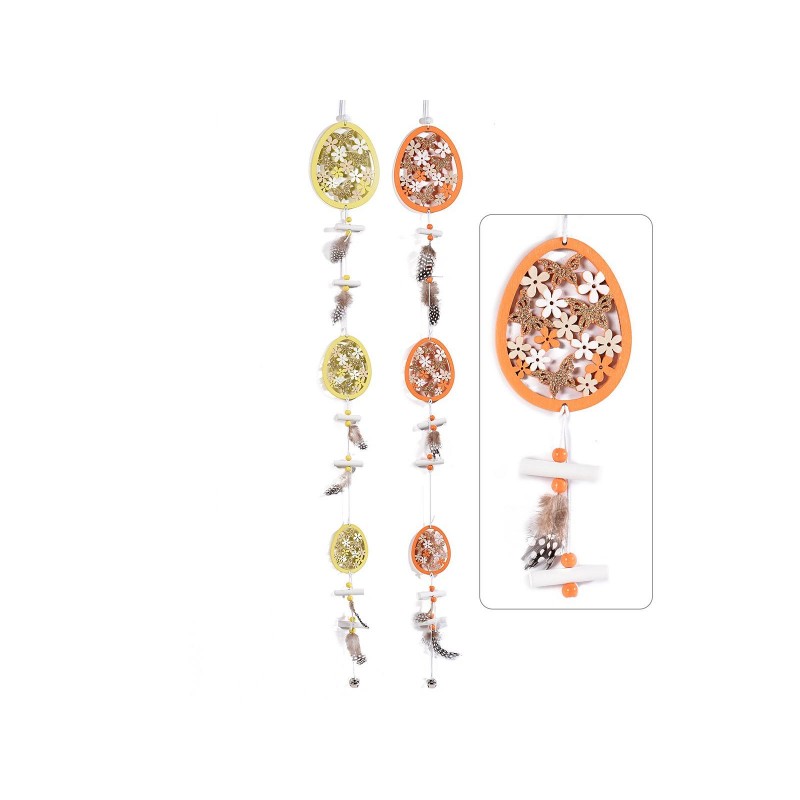 Decorazione in legno colorato con uova e piume da appendere